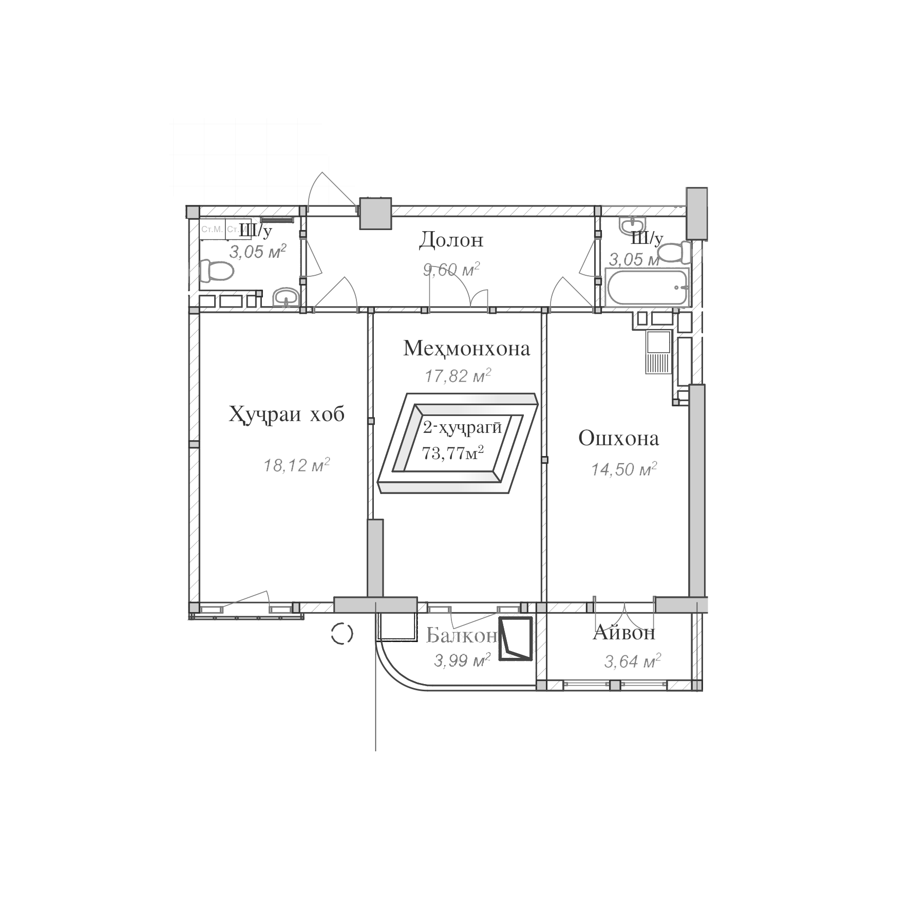 2-комн. Квартира 73.77 м² в ЖК «Согдиана»
