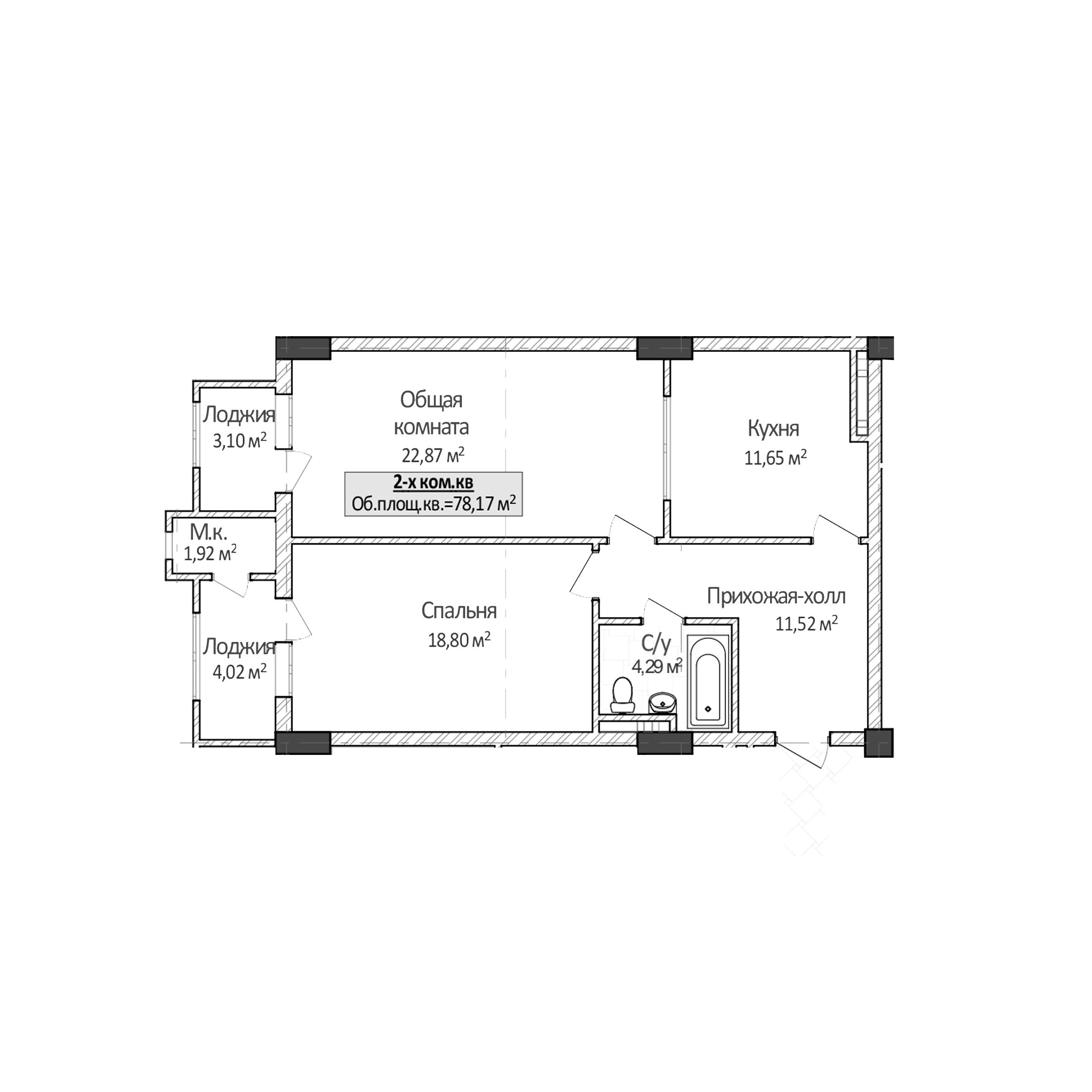 2-комн. Квартира 78.17 м² в ЖК «Тавхид Молл»
