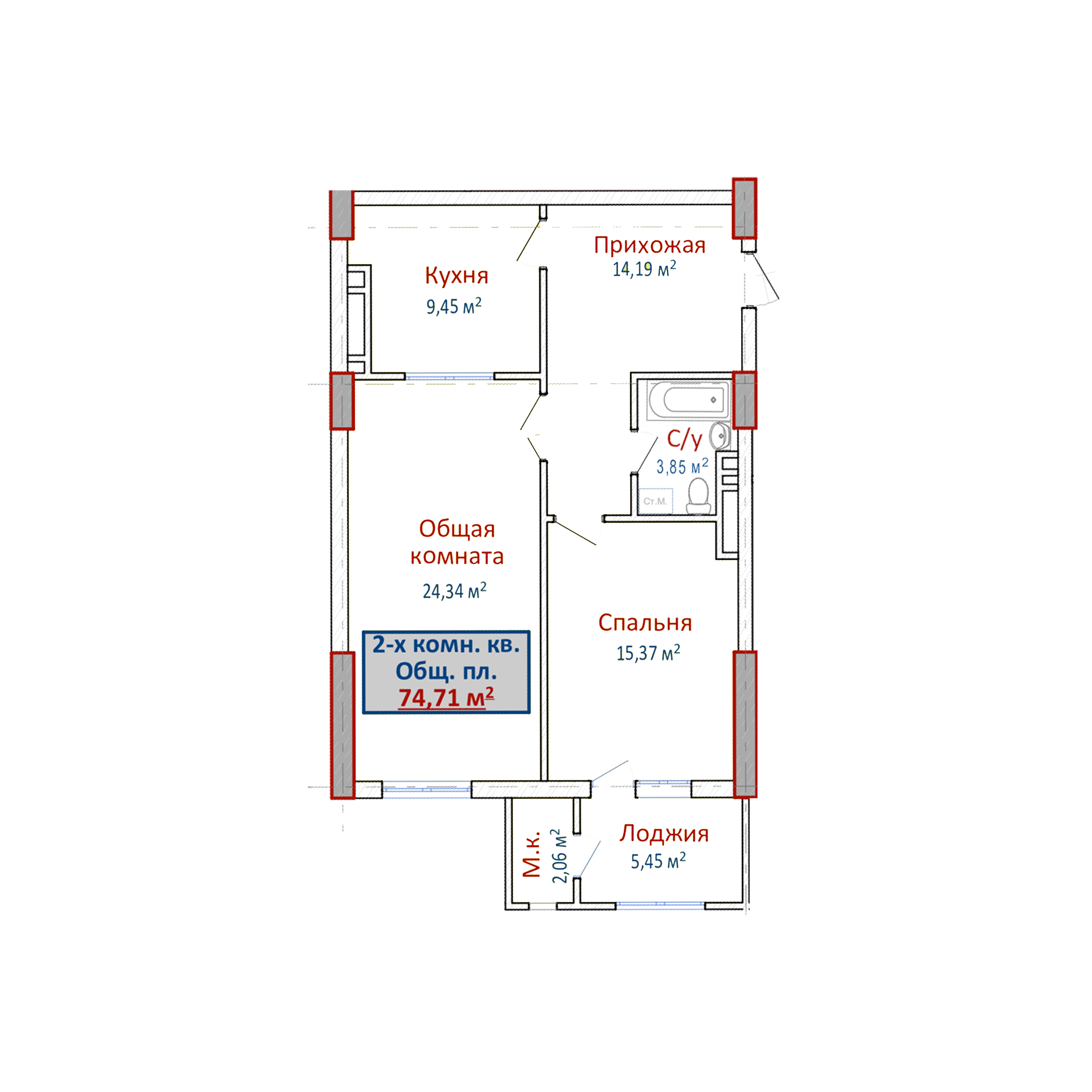 2-комн. Квартира 74.71 м² в ЖК «Тавхид Молл»